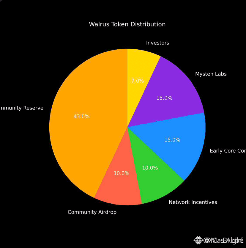 The approach in the token allocation equalizes neighborhood incentives and the development of the core. In line with what Walrus has done on its token utility page, 43 percent of the supply will be allocated to community, 10 percent will be allocated to airdrops to early adopters, and 10 percent to network incentives and subsidies. The core contributors will have 30 per cent with early founders and Mysten Labs (15 per cent each). Another 7 % goes to investors. This design finances continued research, reward builders and makes adoption more likely without creating concentration of power in one group.