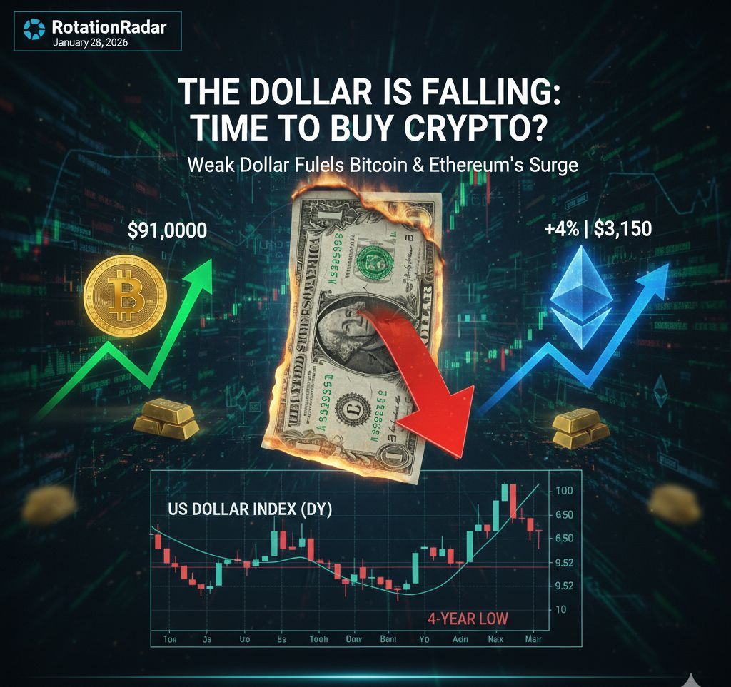 Vedem o "Rotire de Capital." Banii se mută din conturi bancare învechite în viitorul digital. Deși un dolar slab sună înfricoșător, este adesea "carburantul" care începe o urcare masivă a criptomonedelor.