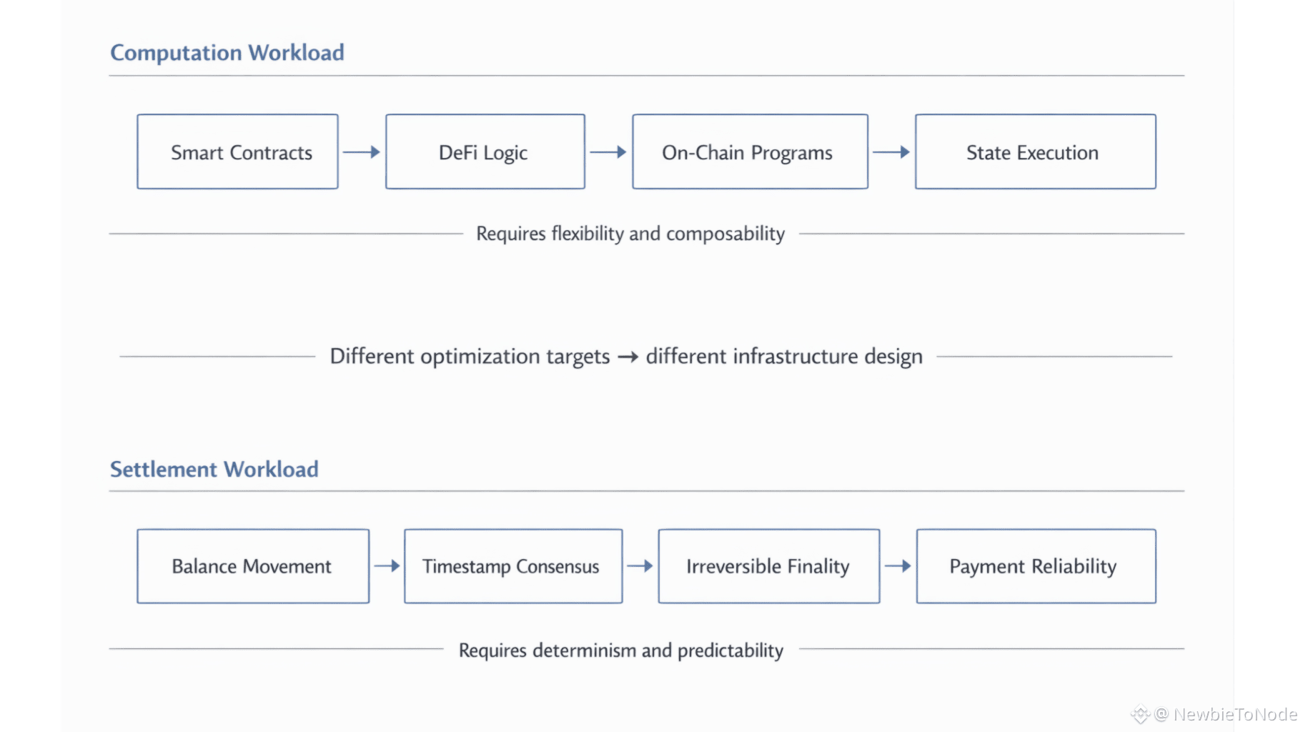The deeper insight is that settlement and computation are different workloads. DeFi needs composability. Payment rails need irreversible confirmation. NFT platforms need expressive contracts. Stablecoin settlement needs reliable balance movement and timestamp consensus. Optimizing one chain for all of these leads to compromises. Running global payment settlement on general-purpose chains is like running airport traffic control on gaming servers — capable, but not designed for that responsibility.