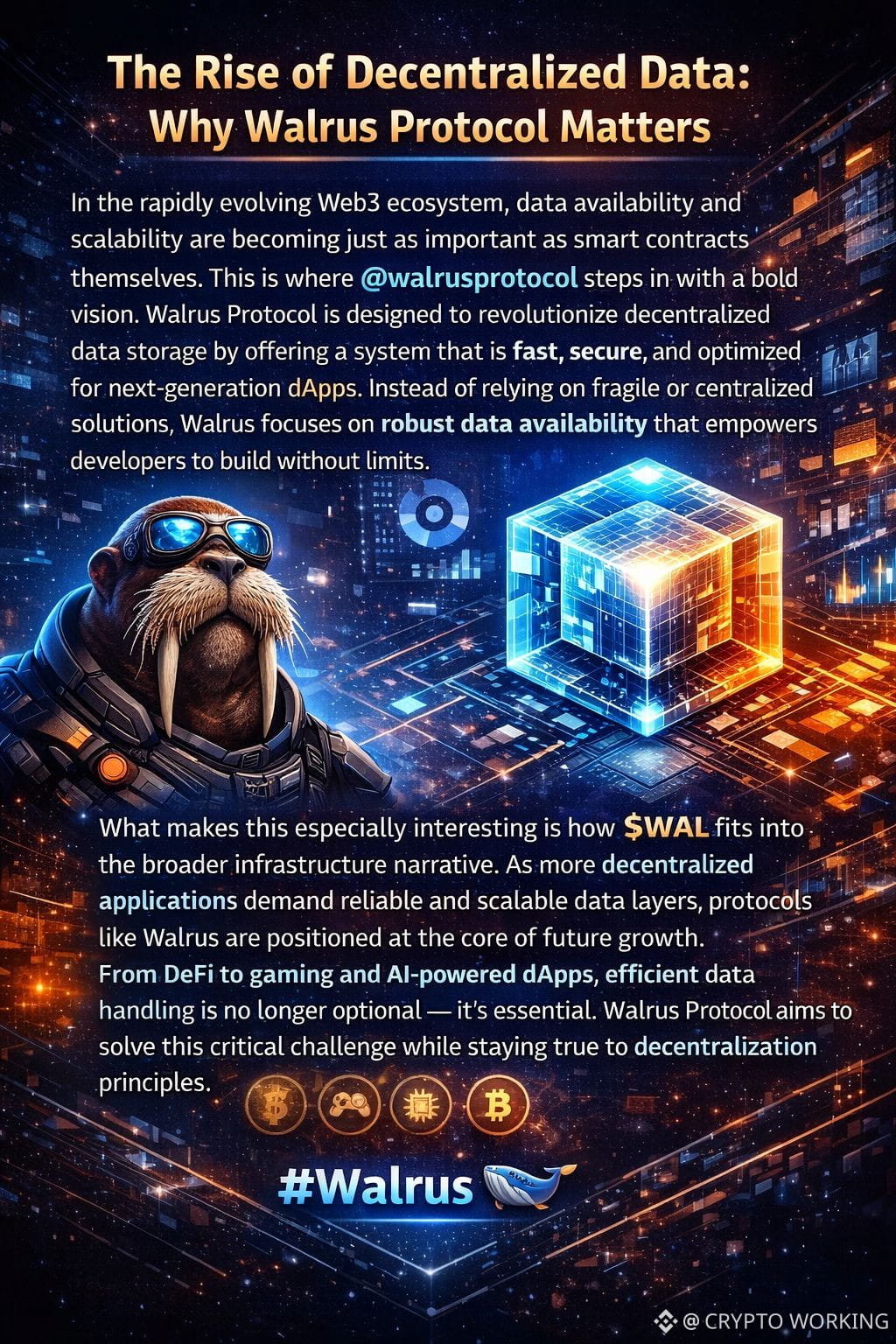 In the rapidly evolving Web3 ecosystem, data availability and scalability are becoming just as important as smart contracts themselves. This is where @walrusprotocol steps in with a bold vision. Walrus Protocol is designed to revolutionize decentralized data storage by offering a system that is fast, secure, and optimized for next-generation dApps. Instead of relying on fragile or centralized solutions, Walrus focuses on robust data availability that empowers developers to build without limits.