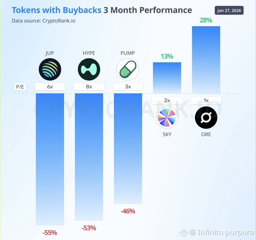 Si miras los protocolos con el valor de recompra diario más alto durante los últimos meses, emerge un patrón claro. La mayoría de ellos todavía están significativamente a la baja, con solo un puñado de excepciones. La presencia de recompras no cambió la dirección; simplemente suavizó el impacto.