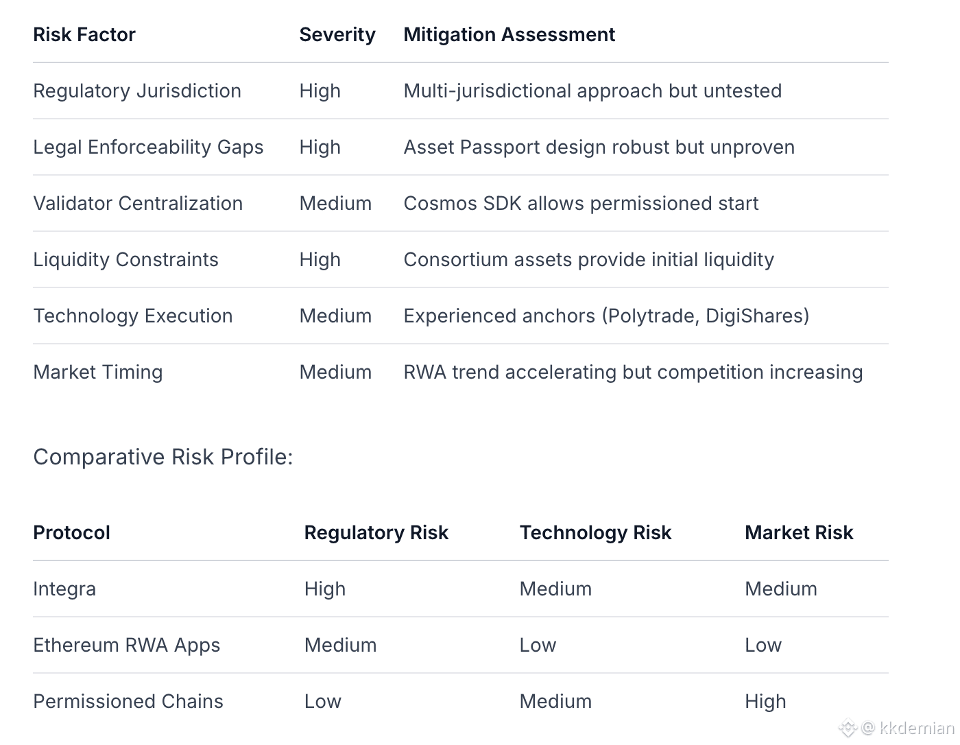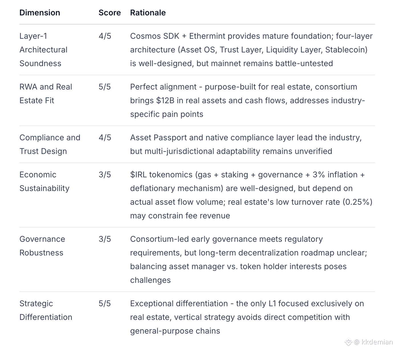 Investment Thesis: Integra excels in architectural differentiation and market positioning, with a compelling vertical real estate L1 strategy. The $12B+ real asset backing and Polytrade's technology integration provide significant advantages. However, execution risk and regulatory complexity cannot be ignored—real estate is one of the most heavily regulated asset classes globally, and the on-chain/off-chain legal bridge remains an unsolved industry challenge.