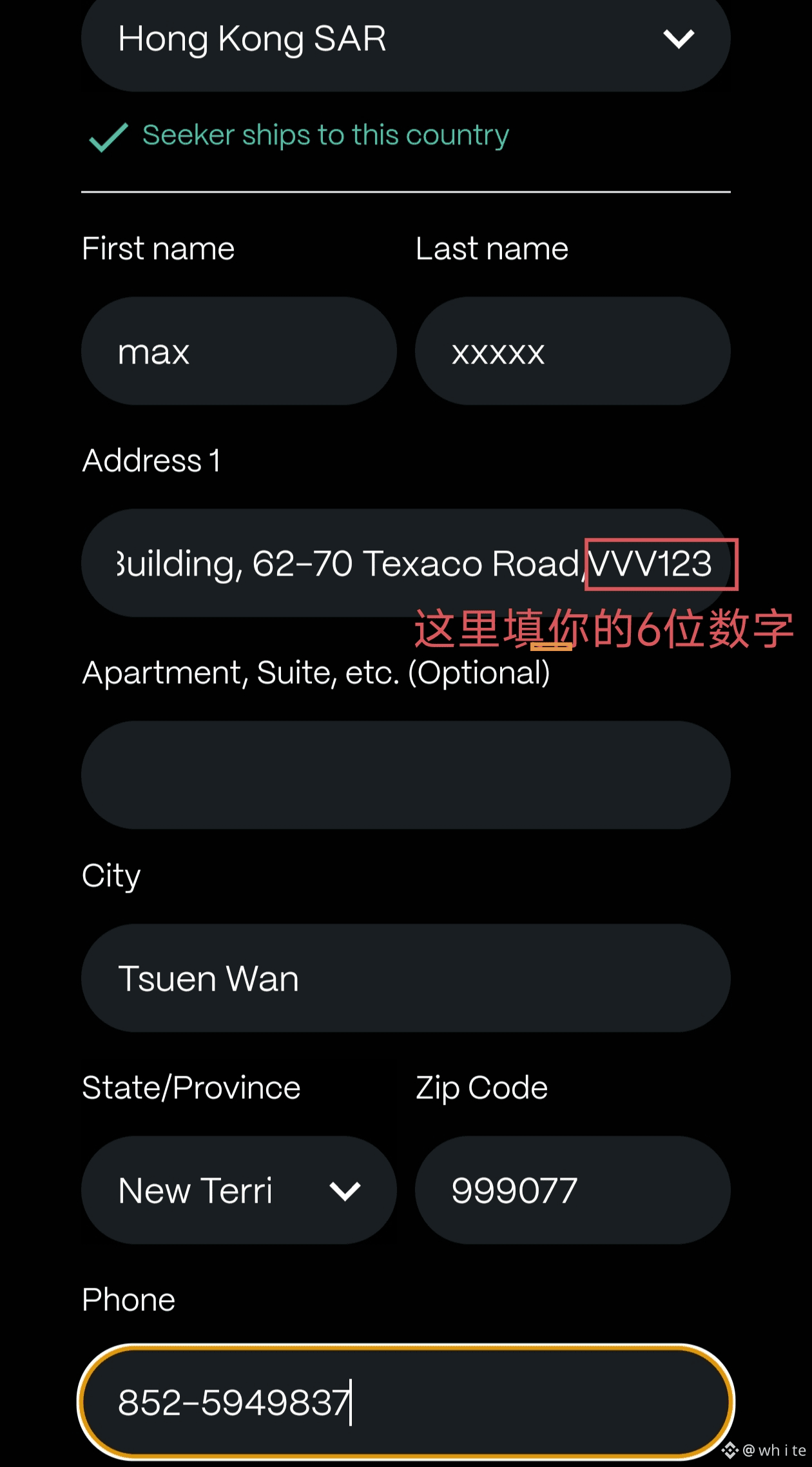 5.填写地址。将你刚刚注册好的转运中国的香港仓库的地址信息一一复制到seeker官网。特别注意复制地址时需要去掉C/O,将后面的数字一并填进地址里。