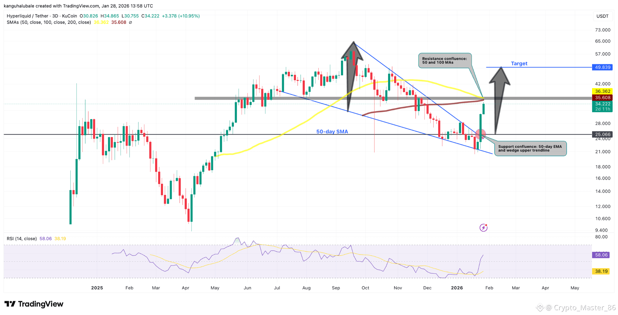 Theo phân tích kỹ thuật, HYPE có thể tiến tới mục tiêu phía trên của mô hình nêm ở mức khoảng $49.80, tương ứng với mức tăng 45% so với giá hiện tại.