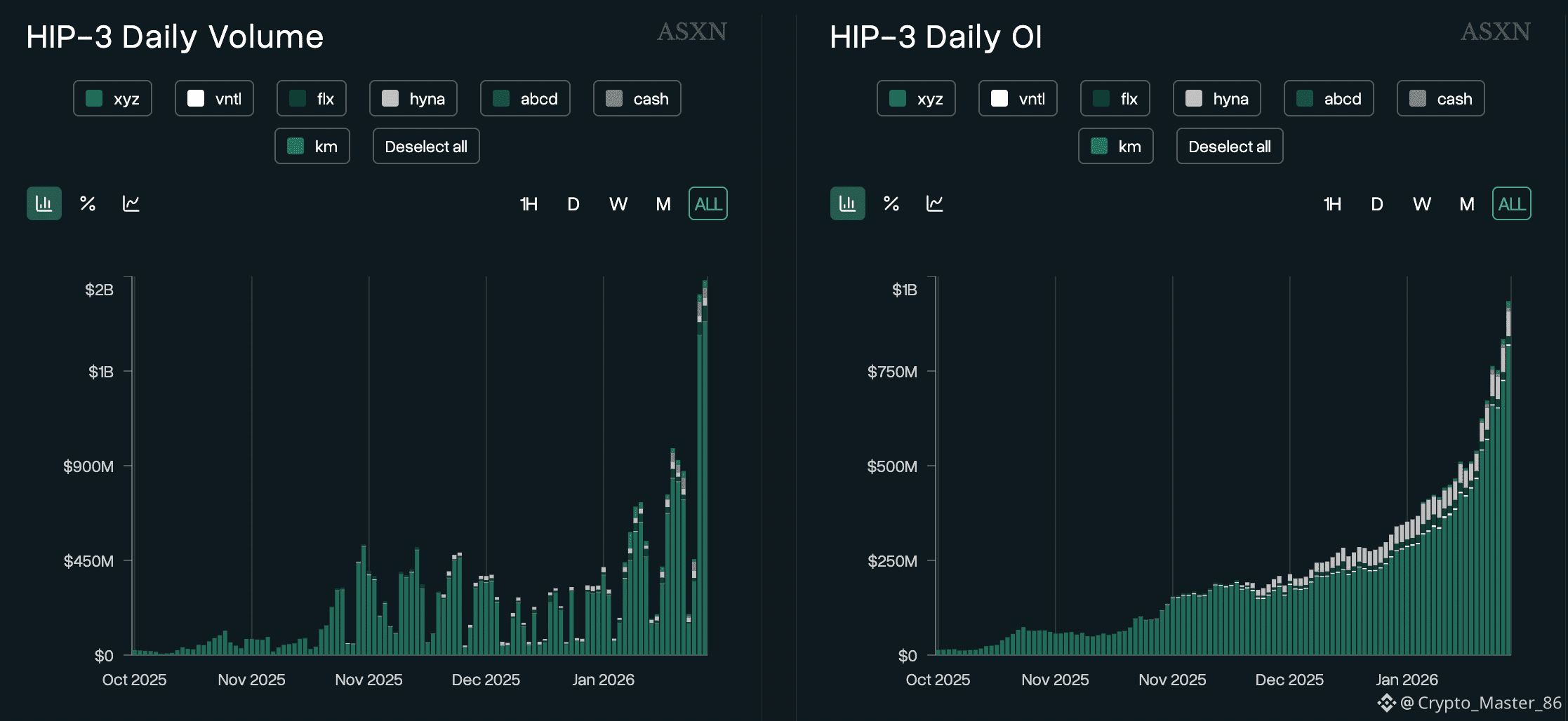 Sức hút của HYPE càng gia tăng khi các sàn giao dịch phi tập trung (DEX) HIP-3 của Hyperliquid đạt cột mốc mới, với OI lên đến $935 triệu vào thứ Tư. Khối lượng giao dịch hàng ngày trên toàn bộ hệ thống DEX HIP-3 cũng lập kỷ lục mới, đạt $1,78 tỷ.