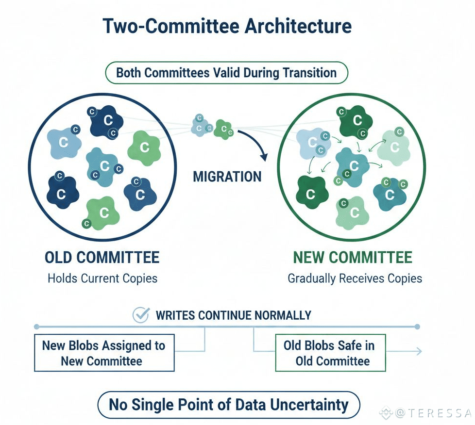 Here's what makes decentralized storage fragile: committees change. Validators rotate. New validators join. Old validators leave. When this happens at scale—migrating terabytes of blobs from one committee to another—traditional systems have to stop accepting writes while migration completes.