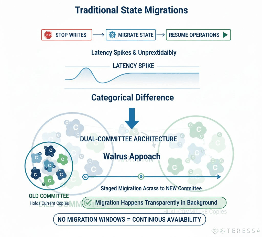 Everyone assumes migrating massive amounts of blob state between committees is a disruptive event that stops the system. Walrus proves you can perform epoch-scale state migrations without blocking a single write. This is infrastructure maturity: the system keeps running while its foundation shifts beneath it.