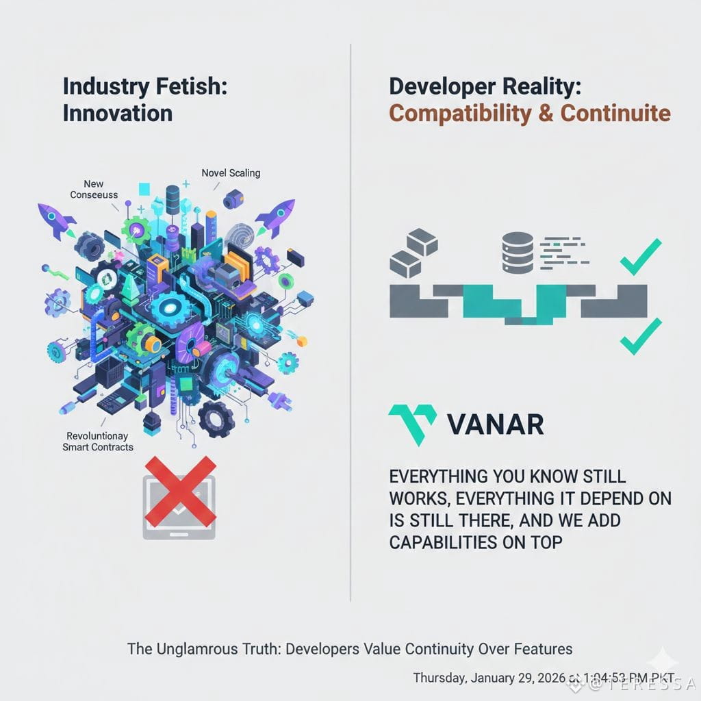 The blockchain industry fetishizes innovation. New consensus mechanisms, novel scaling solutions, revolutionary smart contract capabilities. Yet the feature that actually drives adoption is boring: compatibility. Developers value continuity because continuity is what enables shipping products. Vanar's message—"everything you know still works, everything you depend on is still there, and we add capabilities on top"—is unglamorous but powerful.