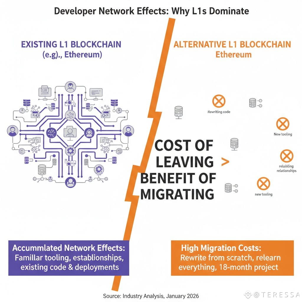 This is the fundamental reason that L1 blockchains accumulate developer network effects. It is not because Ethereum is technically superior to all alternatives, but because the cost of leaving exceeds the benefit of migrating. Building on an unfamiliar chain means rewriting code from scratch. It means learning new tooling. It means rebuilding developer relationships. It means starting production deployments from zero. It means a six-month project becomes an eighteen-month project because of relearning curves and unexpected incompatibilities.