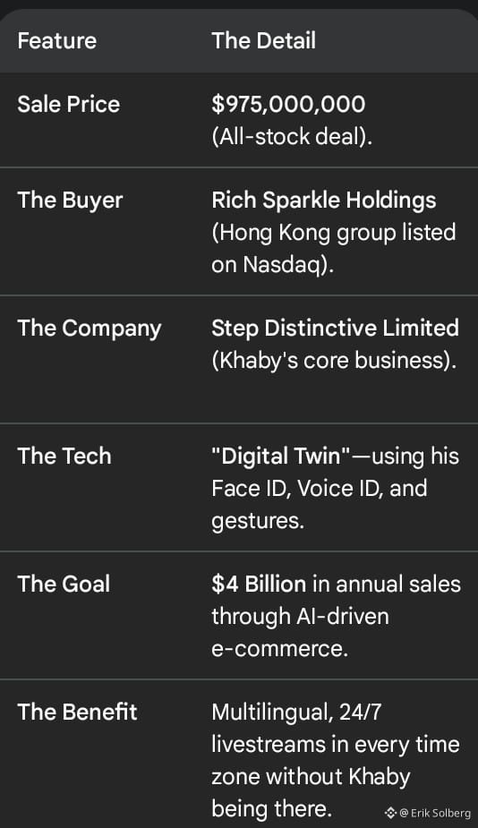 Earlier this month, Khaby sold his company, "Step Distinctive Limited" to a Hong Kong group called "Rich Sparkle Holdings" for a whopping $975M worth of stocks in that company. He has given them his face and voice rights, meaning an AI version of Khaby will now create videos and livestream 24/7. The real Khaby can disappear, sleep, travel, or do nothing and the money will still keep flowing.