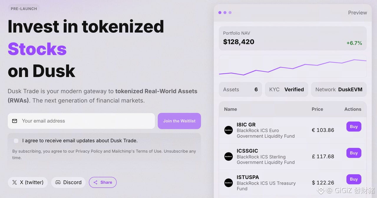 随着金融科技的演进,现实世界资产(RWA)的链上化已成为金融市场下一代变革的核心。Dusk Trade 正是在这一背景下诞生的现代化门户,旨在通过代币化技术,为投资者提供投资股票、基金、ETF、货币市场基金(MMFs)及证书等资产的全新路径