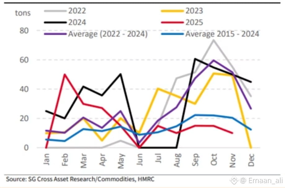London is the world’s dominant gold trading hub. When gold leaves the UK, it often ends up in central bank vaults. Historically, these export figures line up reasonably well with official data released later.