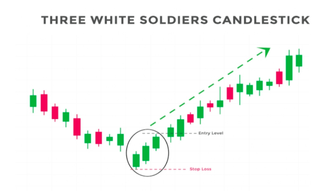 De obicei, întâlnit la sfârșitul unei scăderi susținute, modelul acționează ca un avertisment puternic al epuizării tendinței. Primul "soldat" oprește tendința descendentă, sugerând că urșii își pierd controlul. Al doilea confirmă un nou interes de cumpărare, iar al treilea consolidează convingerea optimistă. Pentru fiabilitate, lumânările ar trebui să aibă codițe superioare minime, indicând închideri puternice. Modelul câștigă mai multă validitate dacă apare după o condiție de supra-vânzare sau la un nivel cheie de suport.