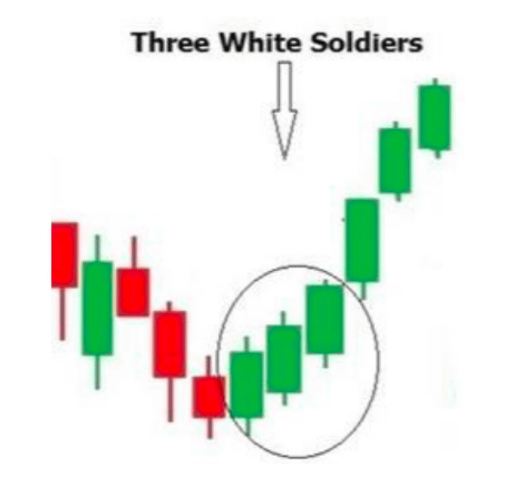 Cei Trei Soldați Albi este un model de cluster de 3 lumânări care semnalează o creștere a prețului. Acestea apar de obicei în timpul unei tendințe descrescătoare și avertizează despre o revenire potențială către o tendință ascendentă. Acest model semnalează o revenire a tranzacțiilor de la bearish la bullish.