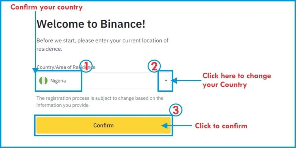 Notă: Țara ta este selectată automat pe baza adresei tale IP. Trebuie să apeși butonul de confirmare acum, ceea ce înseamnă că confirmi că țara selectată de Binance este corectă.