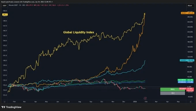 Traderul cu pseudonimul DaanCrypto a atras atenția asupra accelerării indicelui global de lichiditate la începutul anului 2025. Potrivit lui, "mișcări semnificative" au avut loc în toate clasele de active, cu excepția bitcoin-ului.