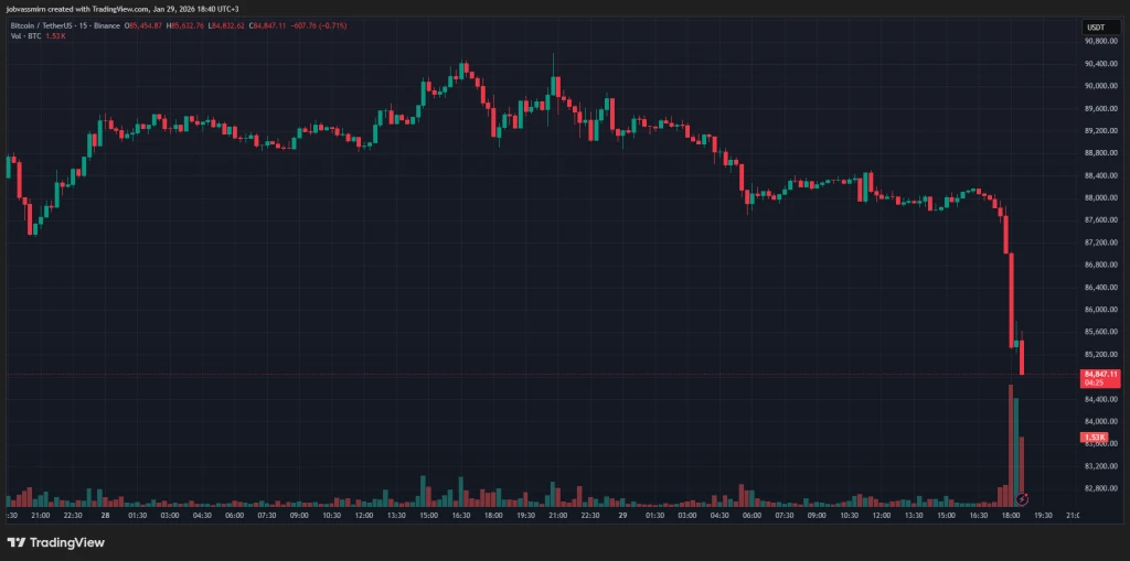 29 ianuarie $BTC a scăzut brusc de la $88 000 la $85 000, pierzând aproximativ 3,5%. Scăderea a venit în urma unei căderi a prețului aurului.