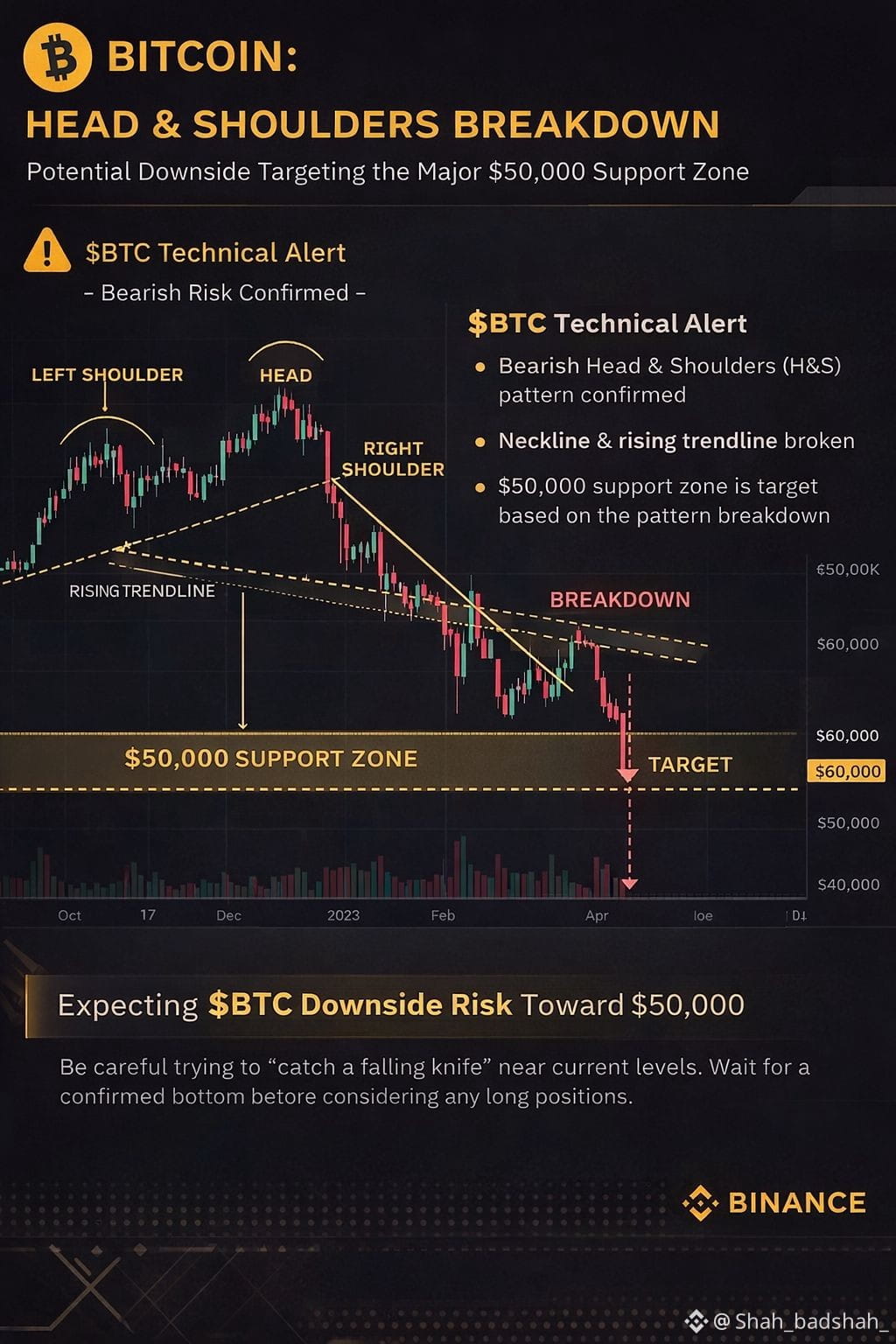 The $BTC daily chart is signaling significant downside risk. A fully formed Head & Shoulders (H&S) pattern has triggered, alongside a decisive break of key short-term support, confirming a shift in market sentiment from bullish to bearish. Technical projections suggest a potential move toward the $50,000 support zone.
