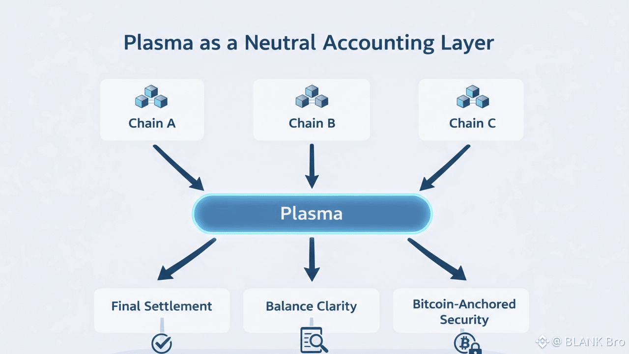Another underappreciated strength of Plasma is its role as a neutral accounting and settlement layer across blockchains. Instead of competing to host every application, Plasma acts as a stable financial backbone — similar to a clearinghouse in traditional finance. Assets may live on different chains, but balances, records, and settlements can remain legible, verifiable, and stable on Plasma. This positions Plasma as infrastructure rather than an application platform.