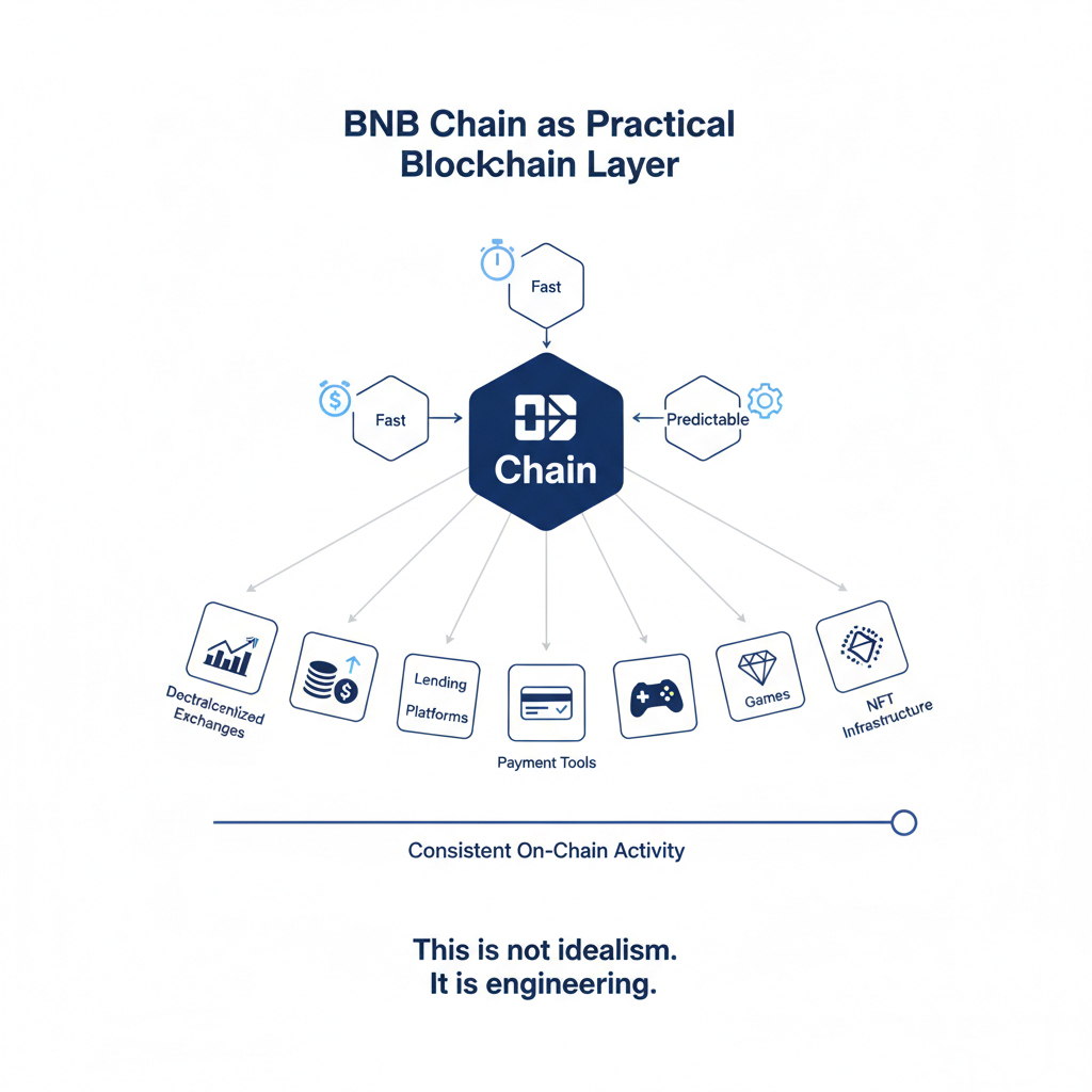 BNB Chain este adesea discutat în termeni tehnici, dar adevărata sa valoare este practică. A fost construit pentru a fi rapid, accesibil și previzibil — calități de care dezvoltatorii și utilizatorii au cu adevărat nevoie.