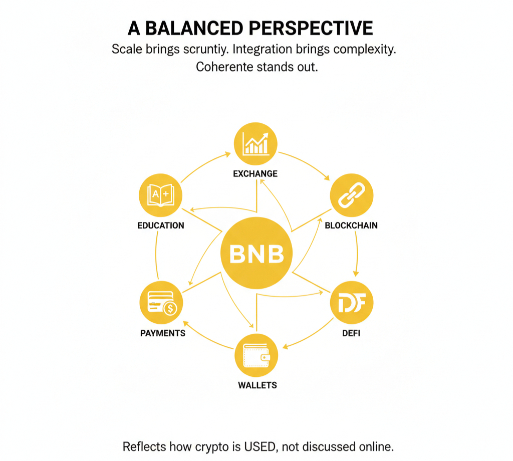 Ecosistemul Binance nu este lipsit de provocări, iar recunoașterea acestui fapt face parte dintr-o viziune matură. Scalarea aduce atenție, iar integrarea aduce complexitate. Dar ceea ce se evidențiază este coerența. Fiecare strat — schimb, blockchain, DeFi, portofele, plăți, educație — întărește celelalte.
