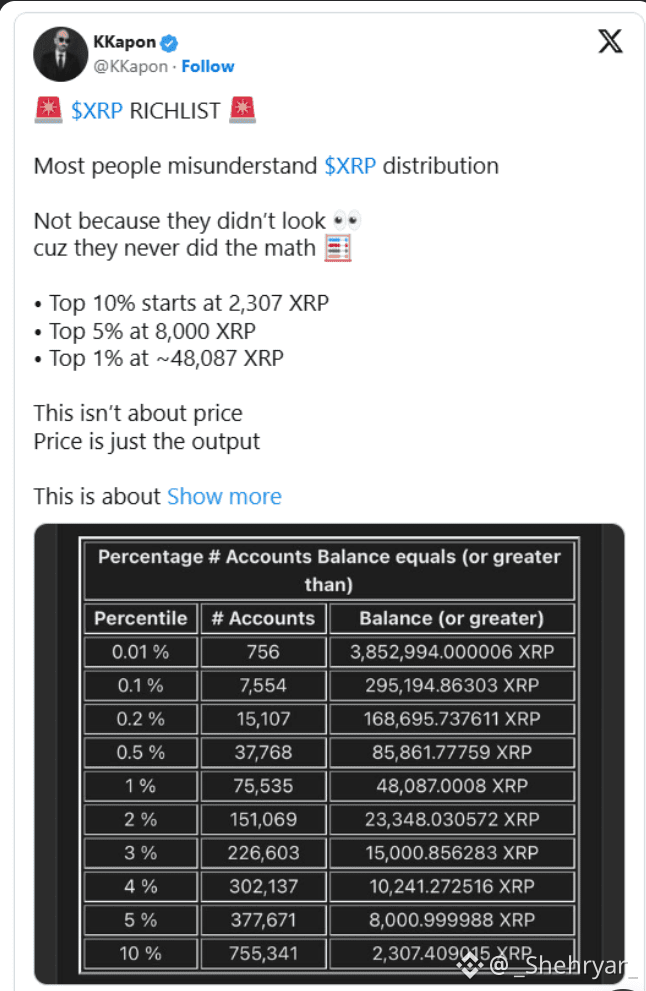 Conversations around “who’s rich” in crypto often miss the real point — and $XRP is one of the most misunderstood examples. Many assume XRP ownership is tightly concentrated or that price alone tells the story. In reality, XRP’s distribution reveals something far more important: liquidity dynamics, not just price action.