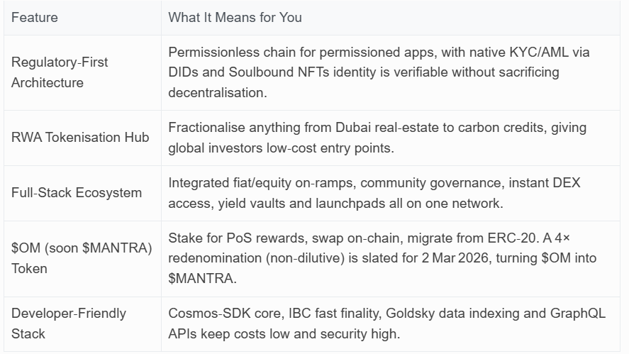 Pe scurt, MANTRA oferă constructorilor un loc de joacă conform, iar investitorilor o poartă de încredere către active tokenizate, fie că este vorba de proprietăți din Dubai, randamente agricole africane sau credite globale de carbon.