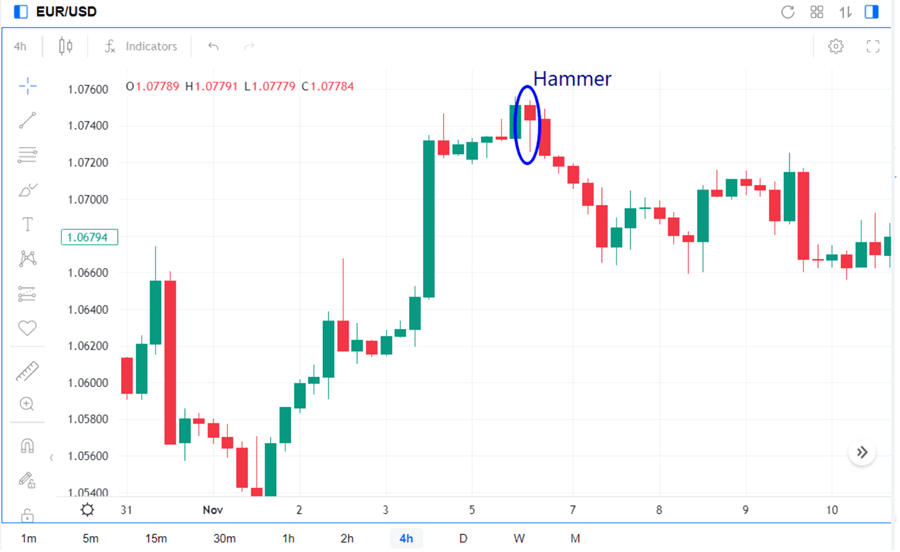 Hammer: Small body at the top, long lower wick (bullish reversal after downtrend)