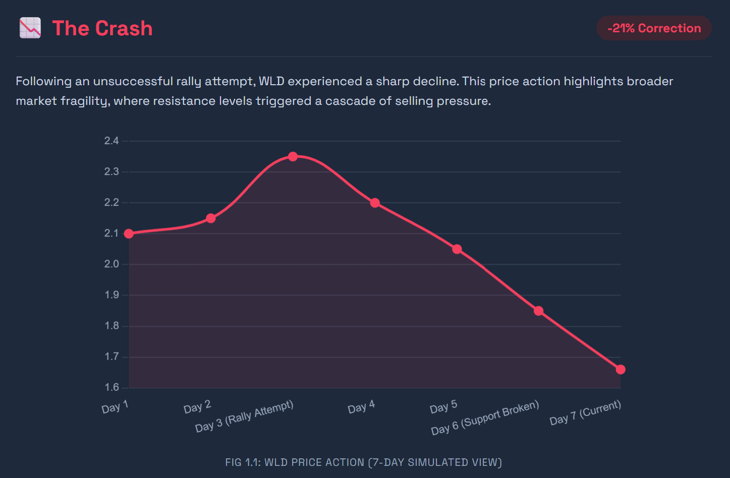 A existat o opoziție puternică față de încercarea WLD de a realiza o ieșire. Prețul a scăzut cu mai mult de 20% ca rezultat al unei unde de vânzări care a început când mitingul s-a oprit. Piața este încă foarte sensibilă la pierderea momentului, așa cum demonstrează această corecție.