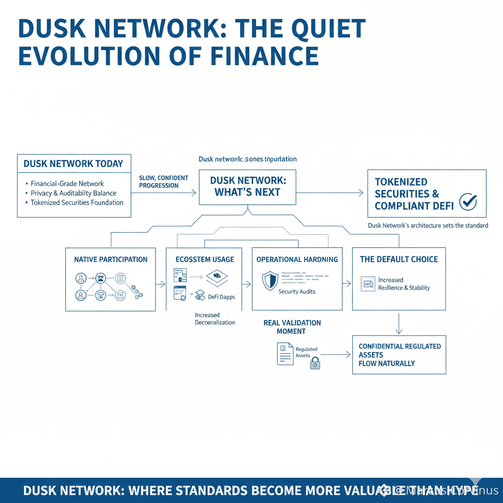 Dusk Network’s “what’s next” is not a flashy slogan, it’s the slow, confident progression of a financial-grade network: more native participation, more ecosystem usage, stronger operational hardening, and the real validation moment where confidential regulated assets don’t just exist on paper, but flow through the system naturally.