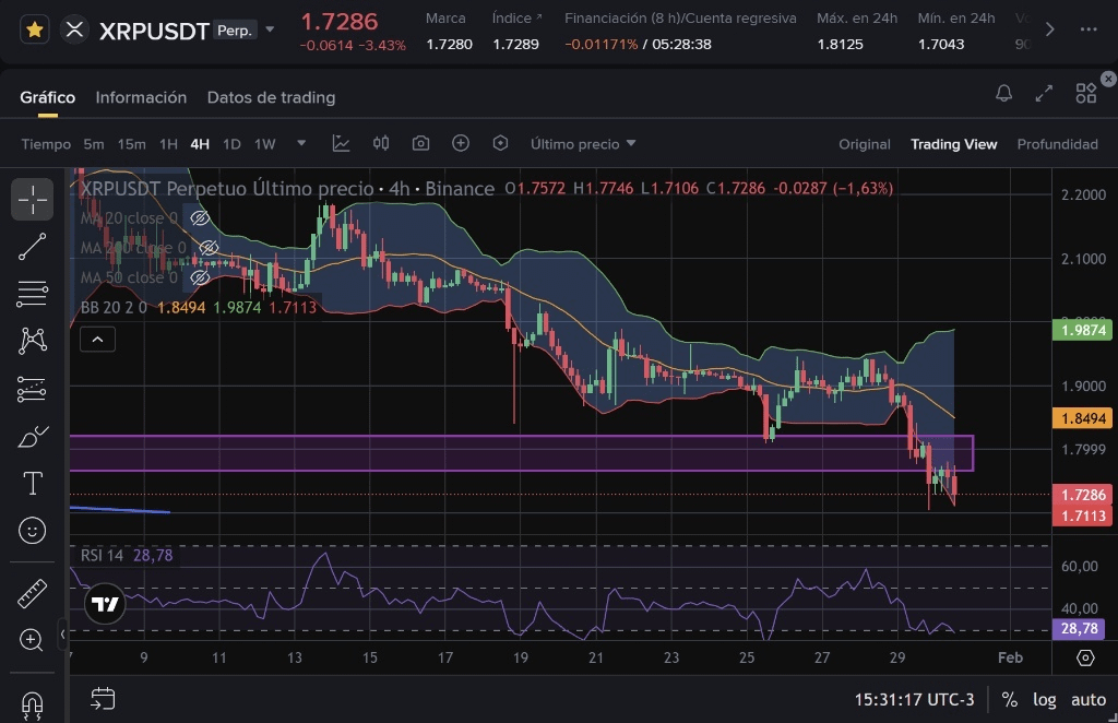 Această săptămână a fost marcată de o expansiune a volatilității în jos. Dacă observăm graficul zilnic, XRP a pierdut zona de confort de 1.80 USDT și prețul se află în prezent "mers pe" banda inferioară de Bollinger.