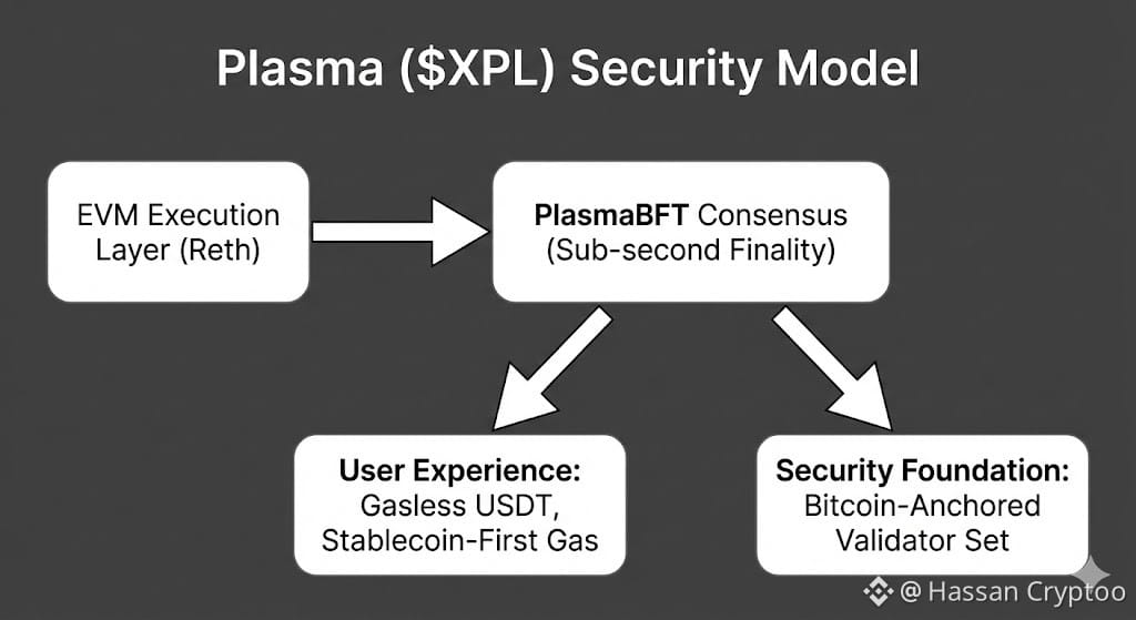 The distinctive layer, the part that moves beyond pure protocol mechanics, is PLASMA's security model. The chain operates with its own set of validators running PlasmaBFT for daily performance. However, checkpoint states are periodically committed to Bitcoin. This is not a two way bridge, it is a one way notarization. The whitepaper details a two phase process where a Plasma block's Merkle root is embedded into a Bitcoin transaction. This achieves what the team calls "Bitcoin anchored security." If the Plasma chain were to suffer a catastrophic consensus failure or a malicious takeover, users could leverage the Bitcoin recorded state to exit honestly. It is a clever hedge. You get the speed and low cost of a modern BFT chain for execution, but the ultimate settlement guarantee, the backstop, rests on Bitcoin's immutable ledger. This design philosophy aims for neutrality and censorship resistance, positioning the chain not as a competitor to Bitcoin but as a complementary settlement highway that periodically ties its truth to the most secure blockchain.