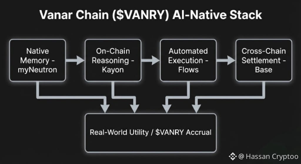 The technical foundation for this comes from Vanar's architectural choices, which they detail as being "AI first." In their framework, this means native support for the core primitives AI systems need, memory, reasoning, and automated execution. Kayon is the reasoning primitive. It provides a standardized, on chain venue for logic, separate from but connected to the memory layer, powering products like myNeutron for recall, and the execution layer, powered by Flows for automation. This interconnected design is key. An agent has the capability to fetch context from memory, execute a reasoning step via Kayon, and initiate an action through Flows. Each step is finalized and logged on the Vanar blockchain. The $VANRY token enables this complete process, functioning as the medium for transaction costs, staking by the validators who protect the network, and the probable governance of these essential AI infrastructure components.