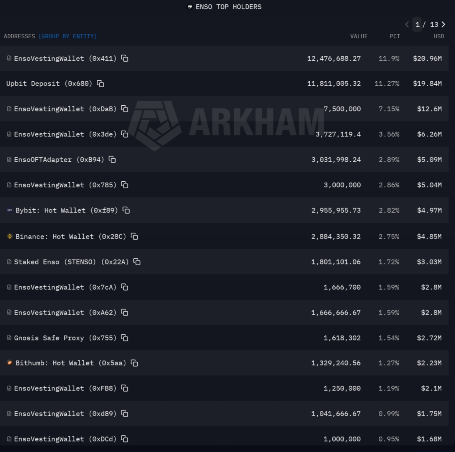 Primul lucru care mi-a atras atenția a fost ordinea absolută în portofele, rar întâlnești așa ceva. Nu sunt balene, nu sunt deținători care să aibă mai mult de jumătate din monede, în topul deținătorilor, portofelele de vesting, burse, staking. Apropo, țineți cont că al doilea cel mai mare deținător este bursa sud-coreeană Upbit, iar acolo monedele sunt tranzacționate doar pe spot, iar spotul este suport.