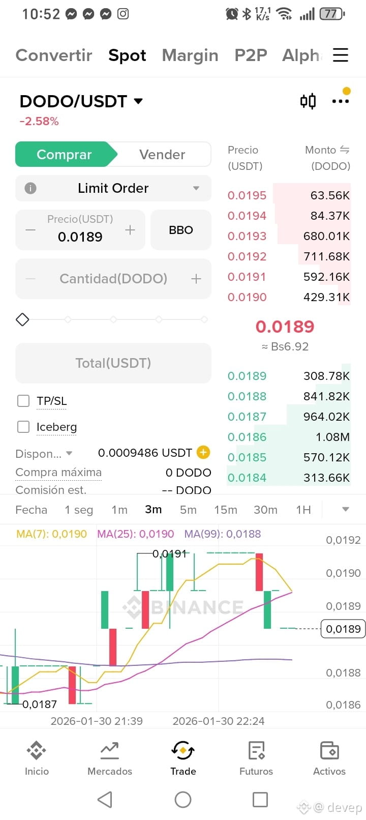 ¿Por qué sigo dentro? El gráfico muestra que DODO está luchando por mantener el soporte de la MA99. Si BTC logra estabilizarse en estos niveles, las altcoins sobrevendidas como esta suelen tener rebotes rápidos del 5% al 10%.