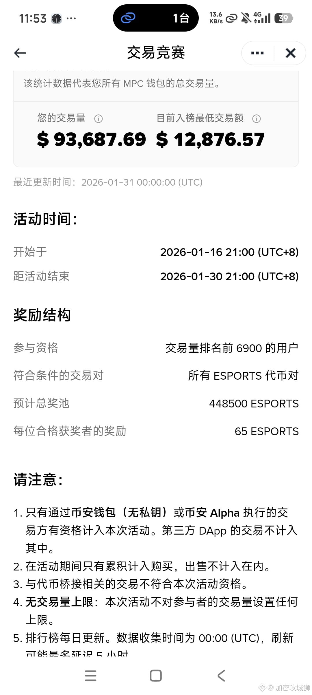 亏麻了兄弟们,这几天真是太倒霉了。昨晚两个交易赛听兄弟们的猛猛刷,一个刷了9w出头,一个clo刷了2w,结果今天出榜单一个1.2w,一个5k😓😓😓,恭喜🎉刚过线的兄弟们吃的满嘴流油,诅咒自己内卷还要说出来卷别人的交易大牛😖😖。
