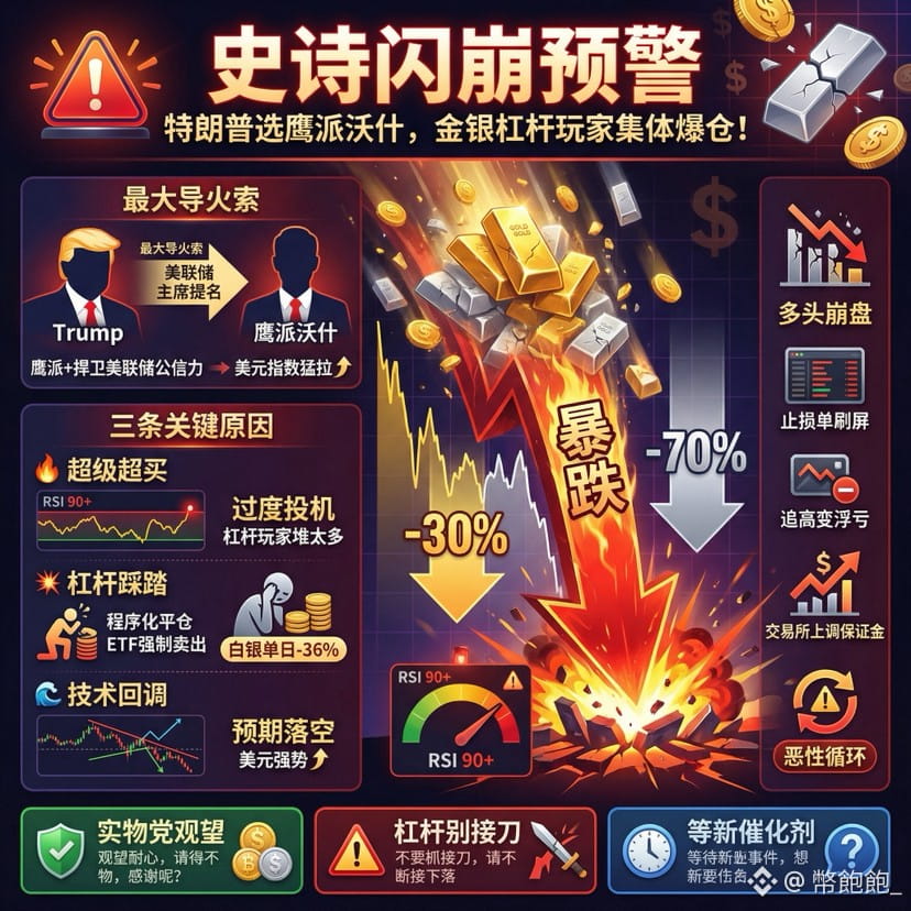 黄金白银这波暴跌,背后基本原因很清楚: 第一, 特朗普提名凯文·沃什当美联储主席 ——这是最大导火索。 市场之前一直赌特朗普会选超级鸽派,美联储独立性被削弱、无限放水、美元继续弱下去,金银就能狂飙。沃什一出场,被看成鹰派+捍卫美联储公信力,市场瞬间松口气:美联储不会乱搞,美元直接反弹,美元指数猛拉,金银的货币贬值交易直接崩盘。
