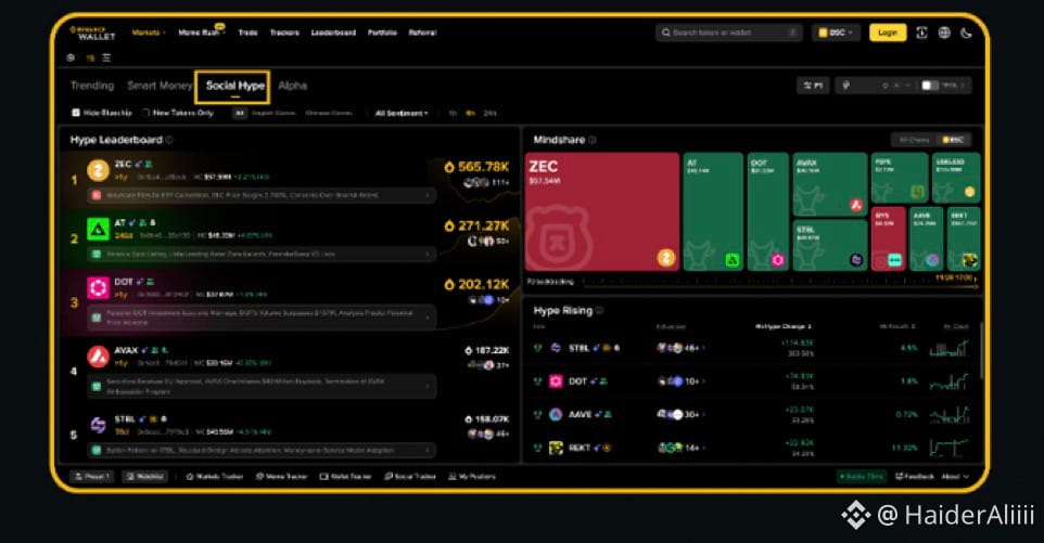 Social Hype scans on-chain and social signals to highlight tokens and topics that are suddenly getting attention.