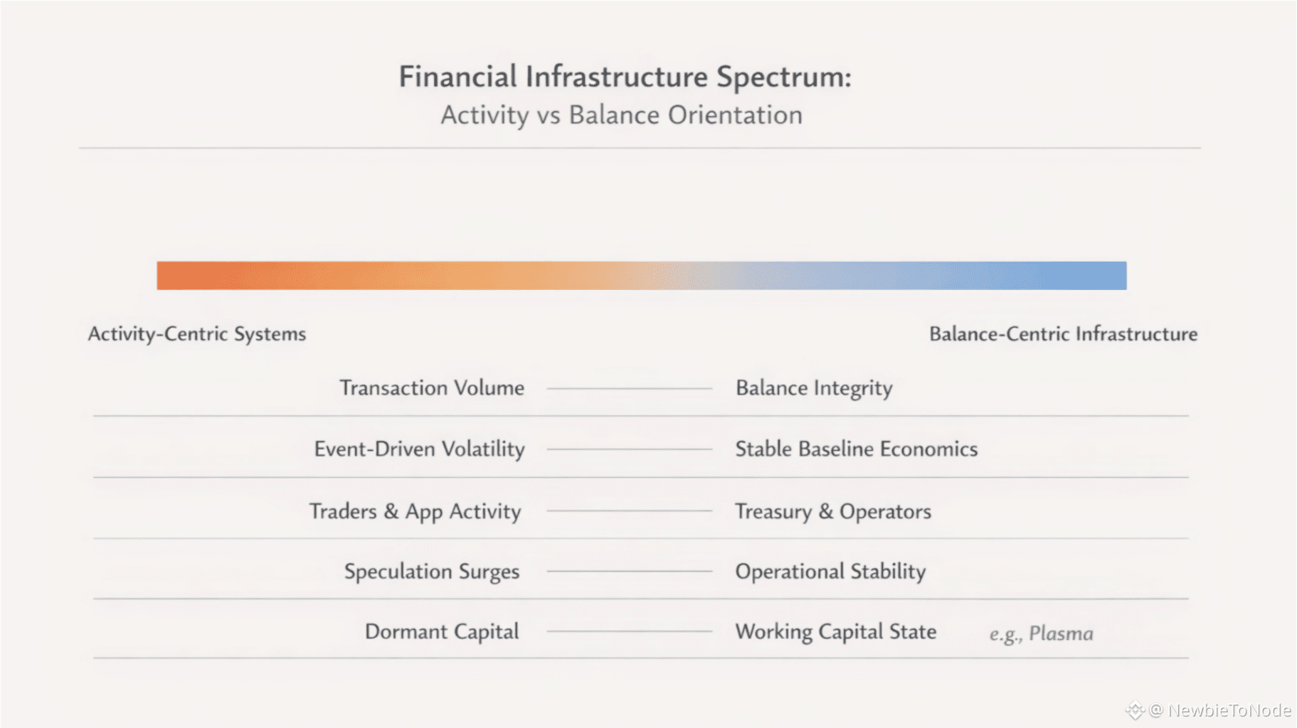 That does not mean activity disappears. Payments, payroll, settlements, and treasury flows still occur. But the baseline assumption is that money exists between events. Infrastructure is there to protect that interval, not just accelerate the moments of transfer.