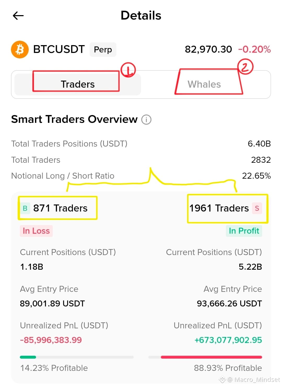 โโซ๏ธThe "Traders" Tab (1): This shows you the sentiment of "Smart Traders"โpeople who have a history of being right. You can see how many are Long vs. Short and their average entry price.