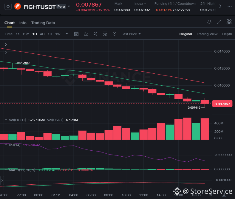 TOTAL REKT. Similar to VANRY but looks even worse on the Daily. Price dropped from ~$0.029 to $0.0079. RSI is 16 on the 1H chart.