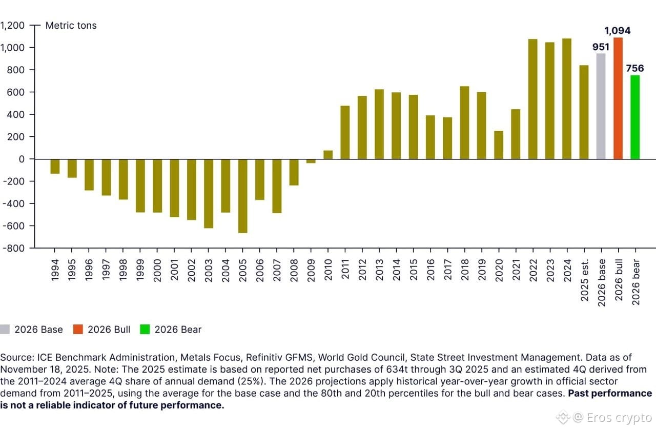 1. Central banks are buying like never before: More than one thousand net tonnes in 2024–2025, led by China, India, and Russia. They are diversifying away from the dollar after sanctions on Russia. Projections for 2026: another seven hundred to one thousand tonnes.
