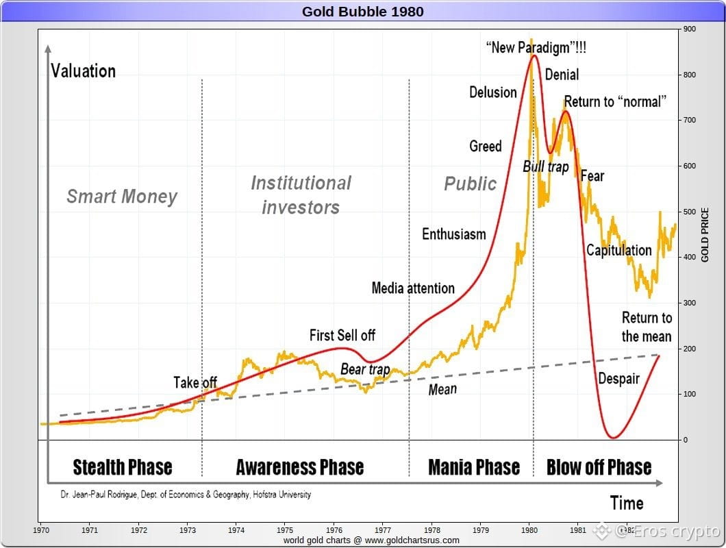Look at this classic chart of the 1970–1980 bull market: stealth, awareness, mania, blow-off phases.