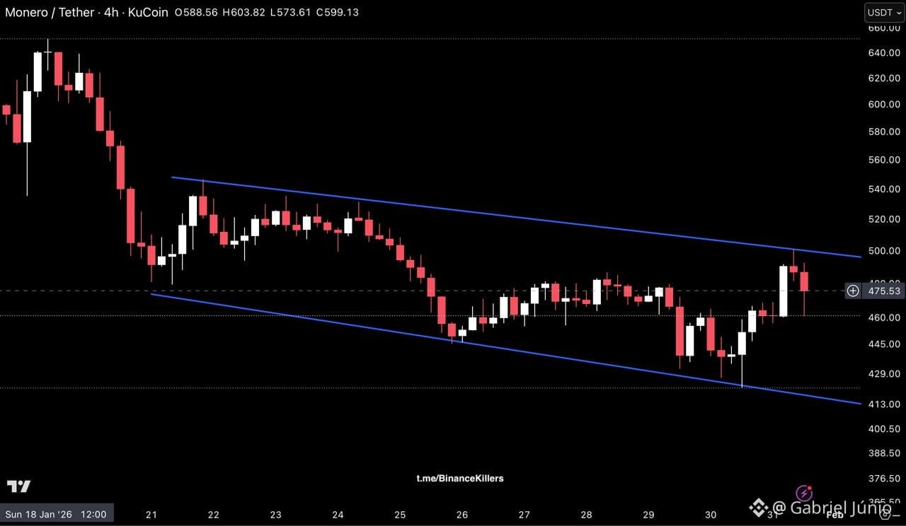 Enquanto o XMR permanecer abaixo do topo do canal, o risco de queda persiste. A faixa inferior entre 420–430 continua sendo a principal área a ser observada caso a pressão de venda retorne.