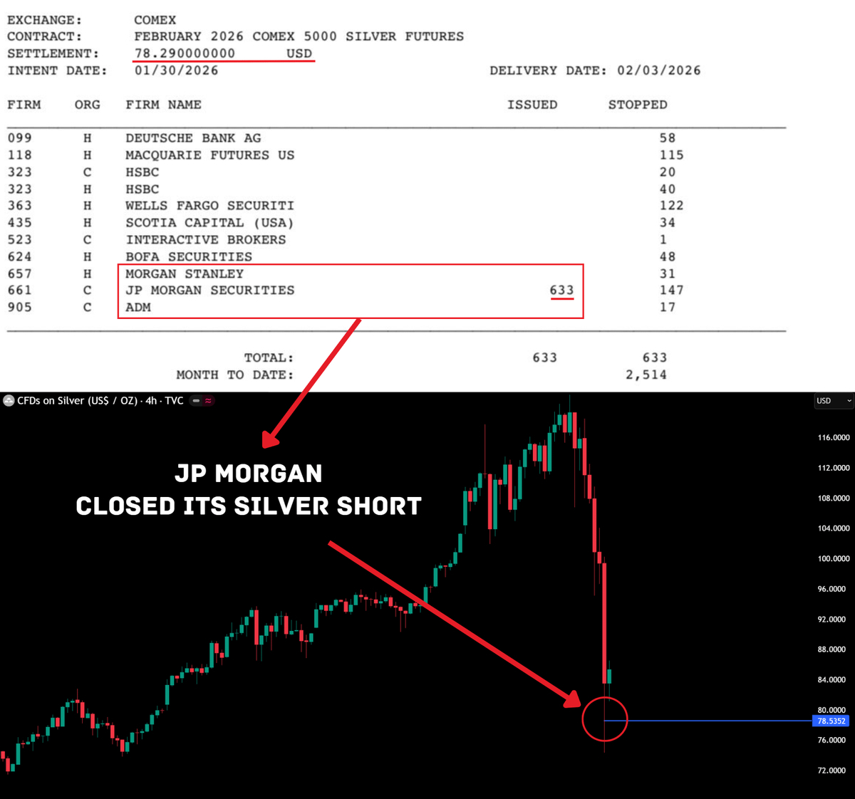 Un raport emis de Bursa COMEX indică faptul că banca a închis poziția sa scurtă de argint la aproximativ 78 de dolari.