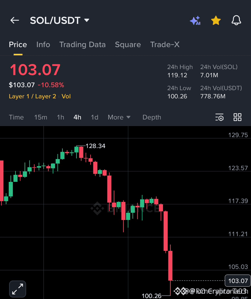 $SOL is currently in a brutal free-fall, crashing through major support levels like they don’t exist. After peaking at $128.34, the price has collapsed to the $103 zone, marking a massive -10.58% dump. The bulls have completely abandoned the floor, leaving the price dangling near the psychological $100 level. 🥊🔥