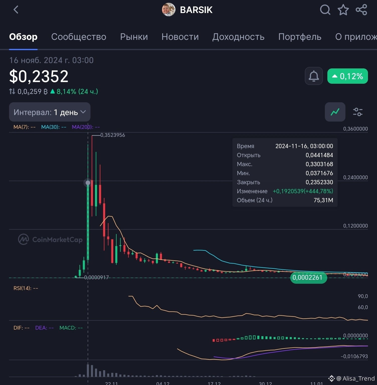 Так же как и вчера, я не рекомендую связываться с этой монетой, на примере Барсика вы увидели какой рост может быть, конечно вряд-ли, но стоит быть максимально осторожными🤔