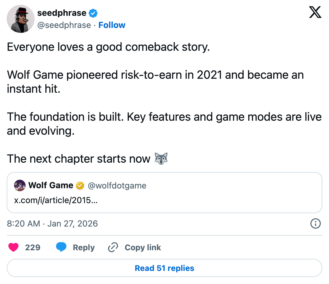 Wolf Game este un joc cripto cu operare pe termen lung centrat pe competiția jucătorilor, conform postării susținătorului său Seedphrase din 26 ianuarie, de la relansarea din a doua jumătate a anului 2025, peste 5000 de oameni s-au alăturat și a schițat o serie de actualizări de gameplay planificate pentru 2026.