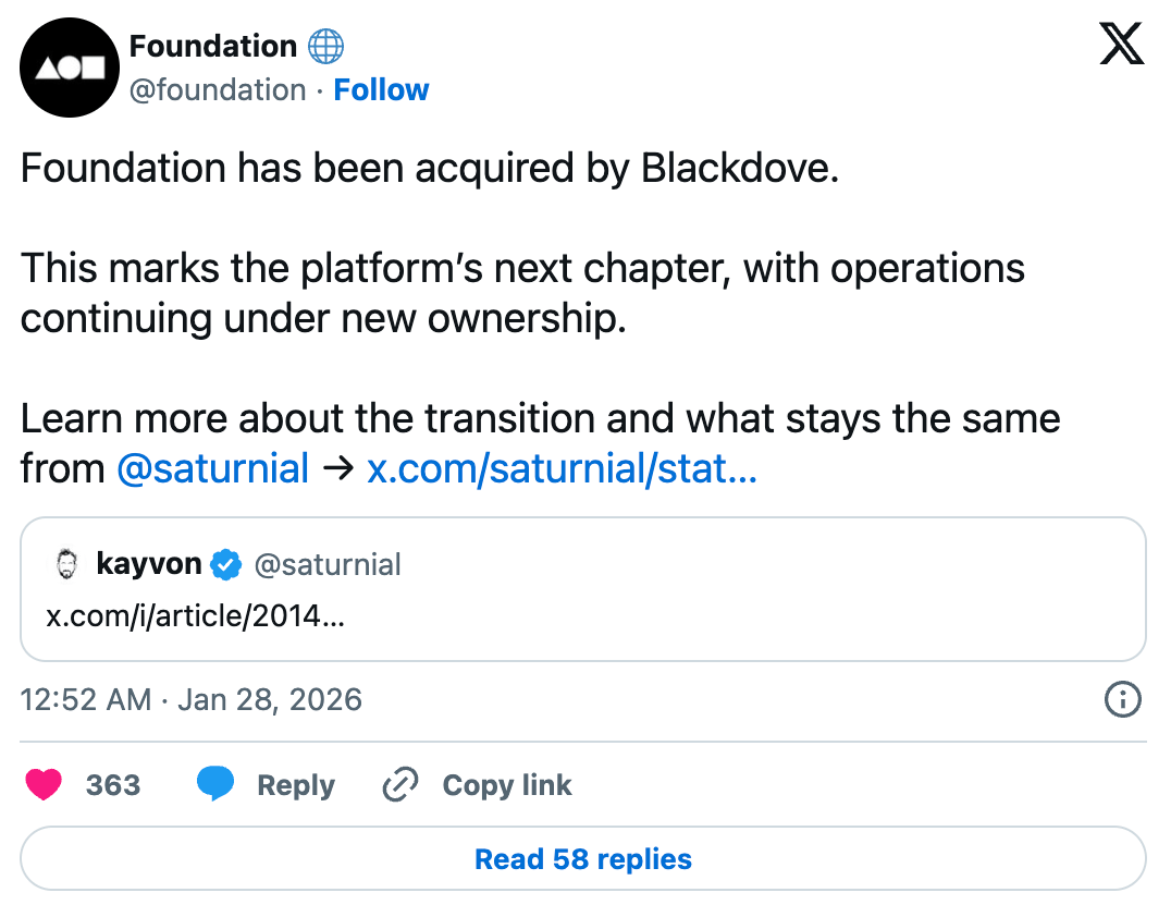 Piața NFT Foundation, cunoscută pentru selecția sa de artiști digitali, a anunțat că proprietatea sa va fi transferată către Blackdove, o companie specializată în prezentarea și conservarea lucrărilor de artă digitală, co-fondatorul Foundation, Kayvon Tehranian, a confirmat această veste într-un comunicat din 27 ianuarie.