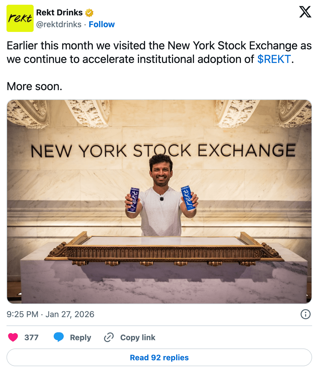 Compania a dezvăluit, de asemenea, că a vizitat recent Bursa de Valori din New York, angajându-se să extindă rata de adopție instituțională a token-ului său de brand REKT (pentru a urmări implicarea și activitățile de brand).